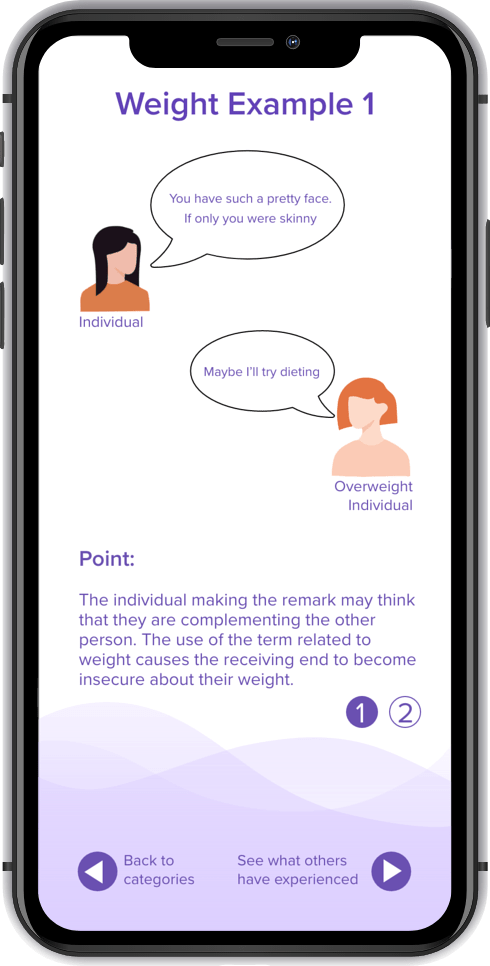 I conducted user testing to find out how I could improve the visual cues for navigating through the screens. Another thing I focused on was finding out whether or not microaggressions were common knowledge or not. If people were unaware of the topic, I would ask whether or not they would be interested in learning about the topic or not.